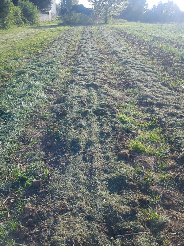 Comme ma prairie est plutôt du genre coriace, j’ai ajouté quelques étapes de défrichage et de travail léger du sol à la houe. Ensuite j’ai suivi la recette…