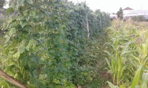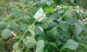Elle est parsemée de sarrasin, engrais vert semé l’automne dernier, mais qui a attendu le semis des haricots en mai pour pousser avec.