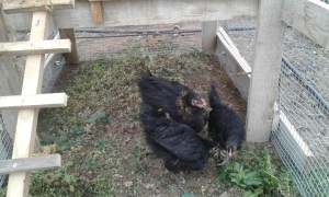 Ce sont des gros poussins – ou des petits poulets – éclos cet automne. Probablement un coq et deux poules… à confirmer quand ils auront révélé tous leurs attributs.