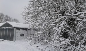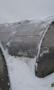 Résultat, une vitre brisée dans la grande serre, plusieurs petites déchirures de bâches et un tunnel, déjà déformé par les vents d’Eleanor, définitivement écrasé par le poids de la neige.