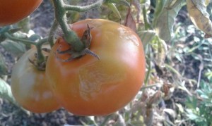 Résultat, des légumes cuits sur pied ! Comme cette tomate qui présente un net « coup de soleil » assortie d’un peu de collet jaune.