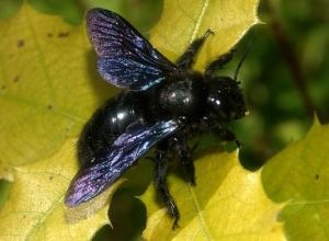 Une grosse abeille solitaire, toute noire avec des ailes noir bleuté, comme des ailes de corbeau.