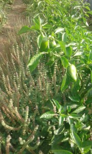 Les derniers petits poivrons dominent une marée de fleurs de basilic sacré, bientôt sèches.