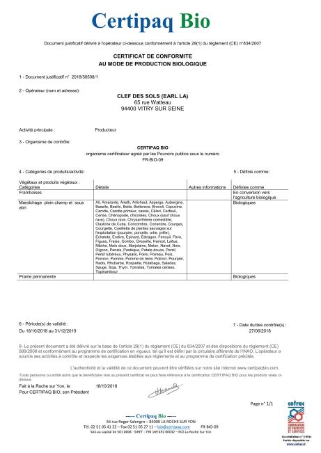 Enfin, c’est officiel, La clef des sols a reçu son certificat de conformité au mode de production biologique, en conclusion d’un engagement pris le 11 juillet 2014.