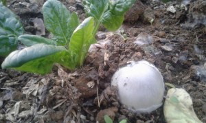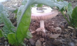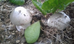 Dans la grande serre, c’est encore autre chose. Au milieu des épinards ce sont des champignons que je vois pousser.