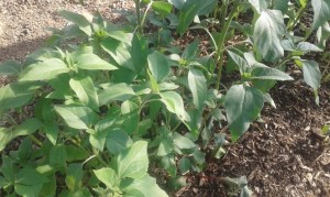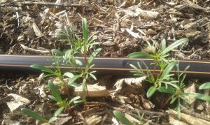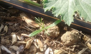 Bingo ! L’irrigation destinée aux courgettes a provoqué la germination des Cosmos qui voisinaient avec les poivrons sur cette planche l’an dernier.