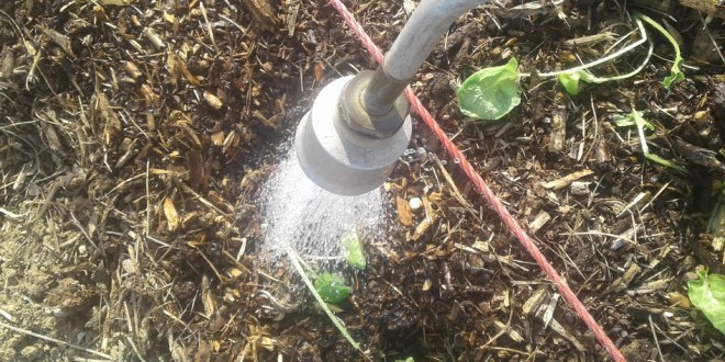 La bonne vieille lance horticole permet de doucher les plants. C’est un peu long alors seuls les semis et les jeunes transplants y ont droit.