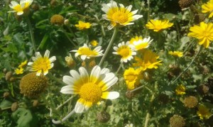 Un ingrédient des salades du printemps, quand le feuillage est jeune et tendre, les chrysanthèmes comestibles arborent fièrement leurs corolles. A ce stade on se contente de les admirer, en attendant de remplir des sachets de graines.