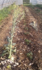 Plus tôt que prévu, la plantation est faite dans un tunnel partiellement désherbé, un chou rave laissé en place pour produire des semences.