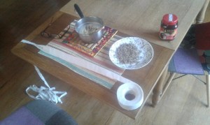 Le papier toilette est un support parfait, un tronçon de rouleau a les bonnes dimensions. Un simple roux à la farine permettra de fixer les graines au bon espacement. Et c’est parti…