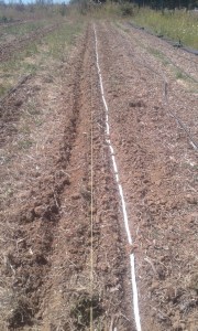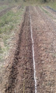 Et voilà la bande déroulée au fond d’un sillon. Les 30m de bande correspondent à une ligne de semis. La deuxième ligne est semée à la volée. Cela permettra de comparer les résultats.