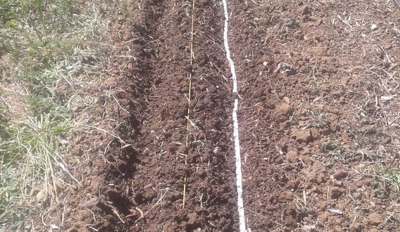 Et voilà la bande déroulée au fond d’un sillon. Les 30m de bande correspondent à une ligne de semis. La deuxième ligne est semée à la volée. Cela permettra de comparer les résultats.