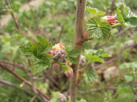 Ici le cassis ouvre ses premières clochettes, roses également. Plus loin, le groseillier à maquereaux montre des clochettes similaires, mais blanches.