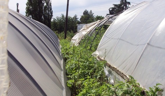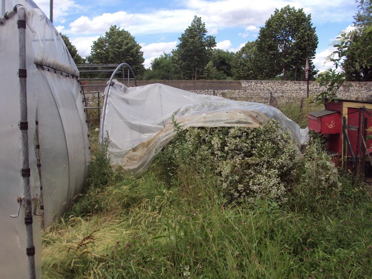 Certaines rafales ont nettement dépassé la résistance des arceaux de métal. Résultat, deux tunnels ont été écrasés par le vent. Celui-ci avait récemment été rebâché de neuf ! Certains choux seront difficiles à récolter…