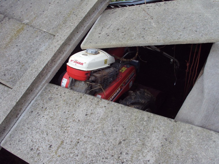 Motoculteur, tondeuse et broyeur sont ensevelis sous un tas de troncs, branches, madriers et palplanches en béton. Un chantier un peu compliqué en perspective.