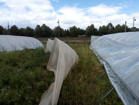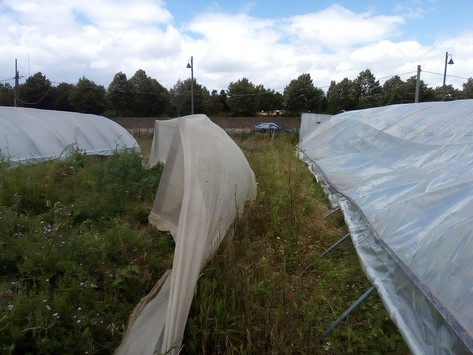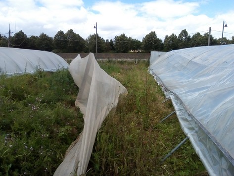 Dès le 26 juin, ma famille à la rescousse venait mettre le site en sécurité. Par exemple vitres brisées rangées de côté, signalisation du réseau électrique à terre, renforcement des tunnels à demi écrasés et… ce dispositif brise-vent permettant de visualiser la force de la moindre brise.