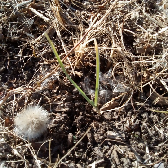 Le repêchage de poireaux à bout de souffle dans la serre à plants aboutit à un tableau anachronique de plantules au milieu des têtes de chardons bien fières.