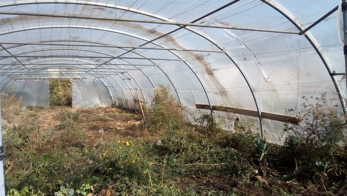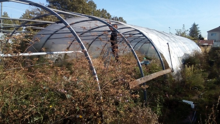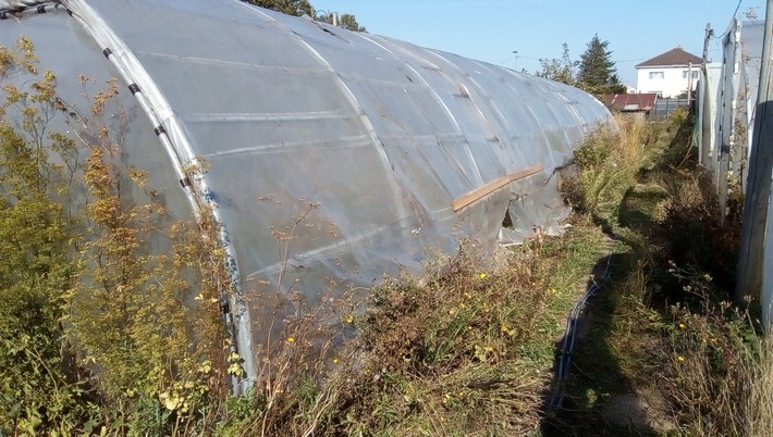 Parmi les abris endommagés en juin, 2 petits tunnels ont été écrasés par le vent. Ils nécessiteront une intervention complète de démontage et reconstruction avant de pouvoir reprendre du service.