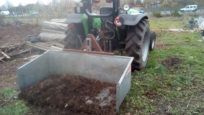 … est utilement secondée par le tracteur et sa bennette, prêtés par un collègue. Merci Mathieu !