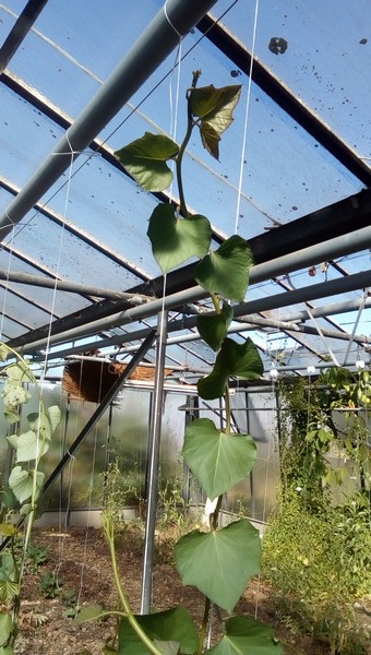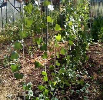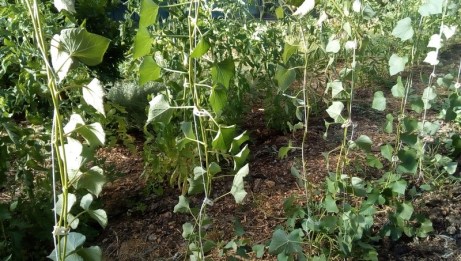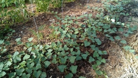 Quand les têtes chercheuses des patates douces viennent traverser les passe-pieds et les planches voisines, le palissage s’impose !