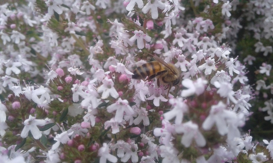 Les abeilles viennent participer au grand ballet des pollinisateurs pour visiter les fleurs des plantes, cultivées et sauvages, présentes sur le site.