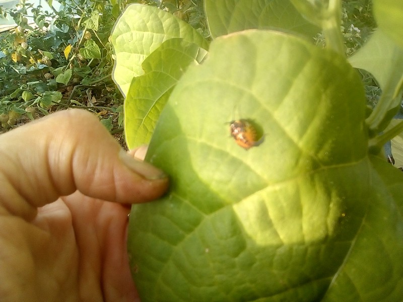 L’image est tellement mauvaise que vous allez devoir me croire sur parole. Ici c’est une punaise ornée du chou que j’intercepte sur une feuille de haricot.