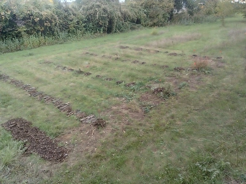 Il y a un peu de travail pour compléter le carré avec arbustes à petits fruits et implantation des végétaux à biomasse. L’implantation complète est dessinée avec des petits tas de compost… histoire d’amorcer la pompe !