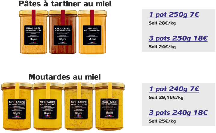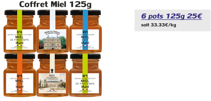 Il est possible aussi de choisir parmi les 8 miels de printemps et 8 miels d’été en composant un assortiment de pots de 250g.