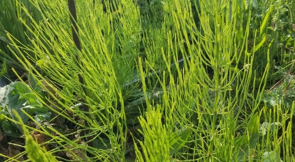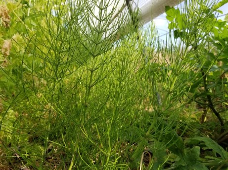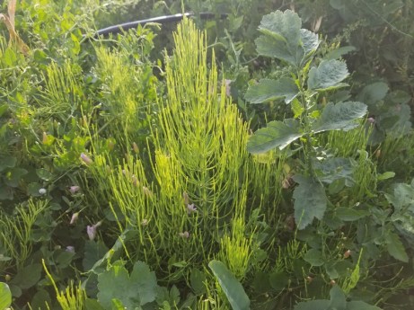 Une plante qui suit sa propre loi, apparaît quand elle le décide, disparaît quand c’est son heure, la prêle des champs est solidement implantée sur une partie du terrain.