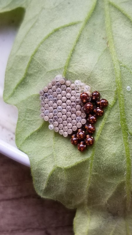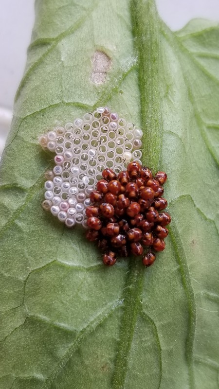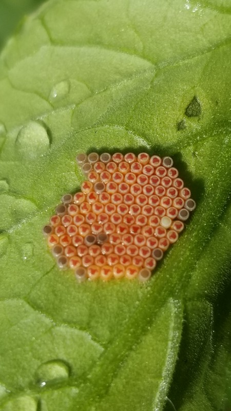En voici une au revers d’une feuille de tomate. Une petite centaine d’oeufs. La plupart sont roses, un est blanc et une série est gris. Les gris sont-ils parasités ? Je n’ai jamais été aussi impatiente de voir éclore des punaises !