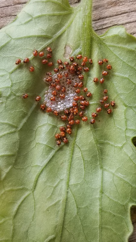 Au bout de 5 jours, voici les petites larves de punaise. Heureusement elles restent groupées et ne cherchent pas à se nourrir les premiers jours.