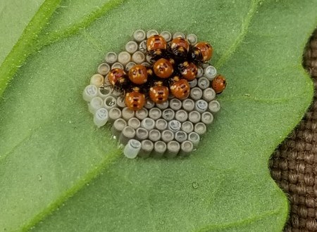 Au bout de 5 jours, voici les petites larves de punaise. Heureusement elles restent groupées et ne cherchent pas à se nourrir les premiers jours.