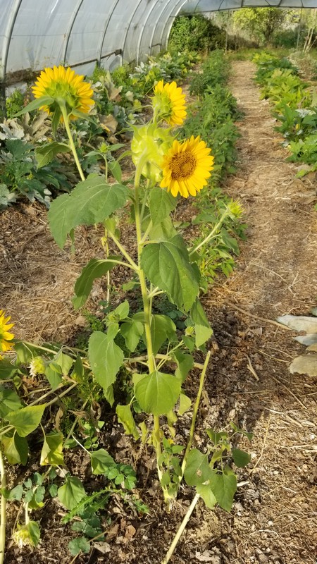 Les tournesols « Soleil » en sont un bon exemple, pour garnir les extrémités de planches. Ici ils sont venus compléter une planche d’amarante sous tunnel.