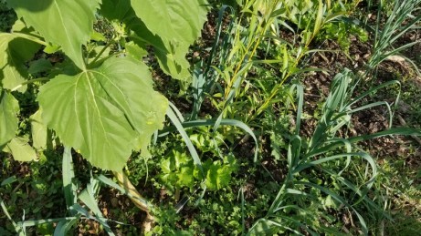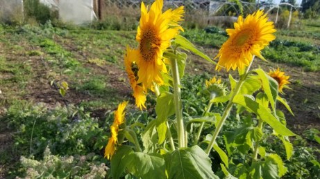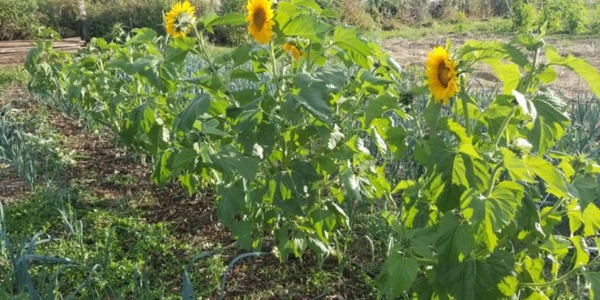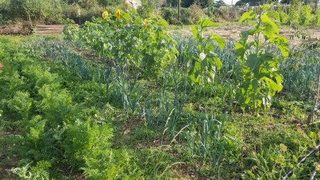 Un peu plus loin les tournesols marquent le milieu de la planche. Ce n’est plus seulement un colmatage de bout de ligne mais bien une composition syntropique.