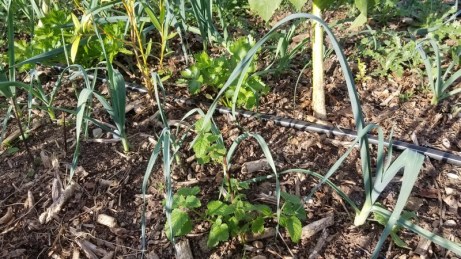 La vocation initiale de cette planche est de produire des poireaux. Ils sont accompagnés d’une ligne centrale qui associe, outre les tournesols, des boutures de saule et de sureau et des céleris.