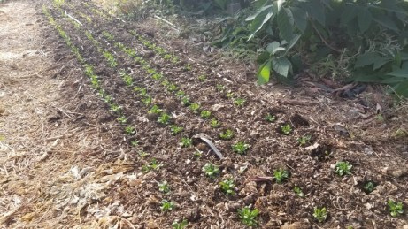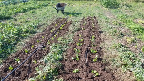 Ici ce sont 2 planches de chicorées, la salade la plus résistante au froid. Ayant correctement repris malgré les grosses chaleurs, elles ont droit à un désherbage et une recharge de matière organique.