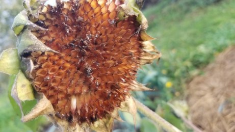 Petit coup d’œil au passage sur les tournesols qui tenaient compagnie aux poireaux sur une des planches. Les fleurs ont été consciencieusement dépouillées de leur graines !