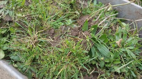 La récolte contient une profusion de plantes rustiques, plantain lancéolé, plantain majeur, graminées non identifiées, picris, trèfle blanc et violet, pâquerette, etc. C’est parfait pour combler quelques creux dans les parties basses du terrain.