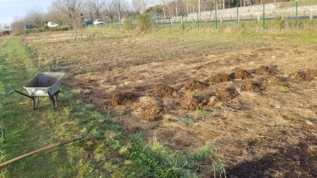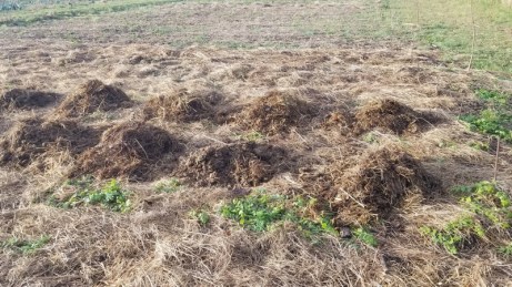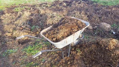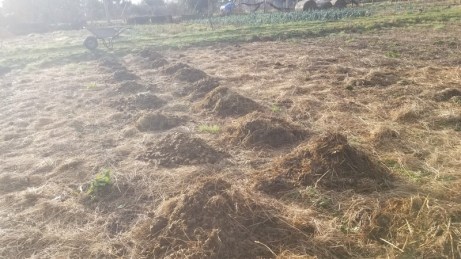 Un petit tas pour chaque plant de potiron. La tournée des brouettes ne fait que commencer !