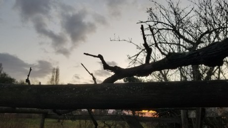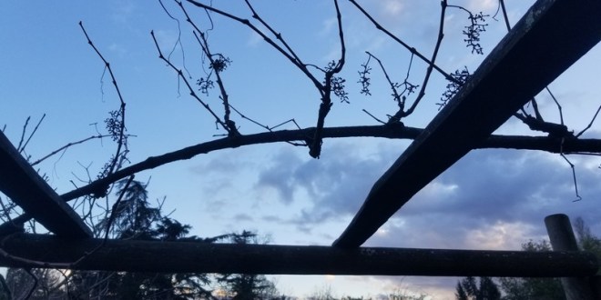 Et voilà le résultat. A la lumière du soleil couchant, la vigne, palissée sur une treille affermie et taillée de frais, est prête pour le printemps.