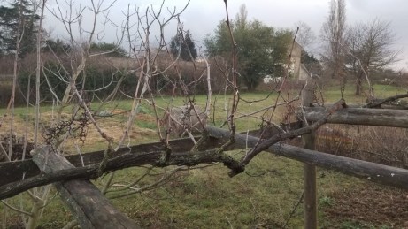 Puis la vigne a suivi le mouvement d’une branche principale, cassée par gros vent. Il a fallu démêler, débiter, trancher, séparer… pour finalement en sortir 3 beaux ceps de vigne et construire une treille.