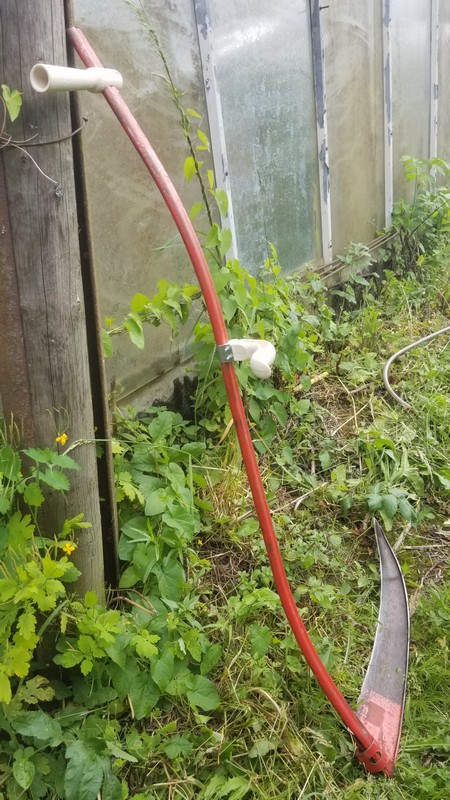 En attendant de trouver une solution de réparation, je décide de remettre en service la version lowtech de l’outil, une bonne vieille faux que mon prédécesseur avait laissée dans un coin.