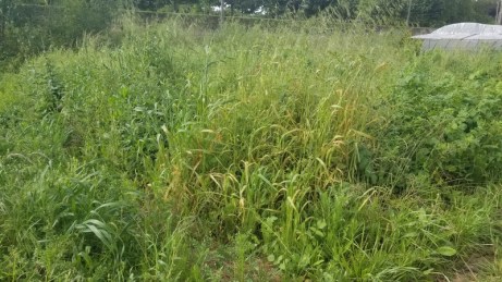 Naturellement la zone destinée à recevoir ces cultures a profité de l’attente pour prendre un air de forêt vierge. La technique habituelle aurait consisté à broyer cette végétation, puis passer la grelinette pour enlever les racines, avant de planter. Mais c’est ce qui a si mal réussi aux laitues et aux physalis.