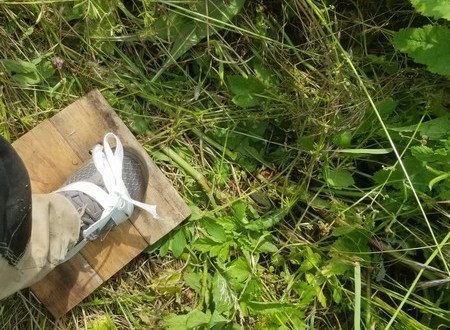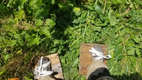 Encouragée par la réussite des plantations de choux et laitues au milieu de la végétation foulée et grossièrement hachée à la houe, je décide de continuer. Mais j’aimerais tout réaliser avec les pieds.