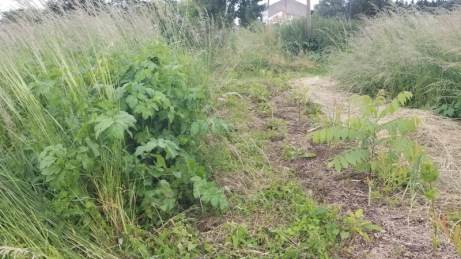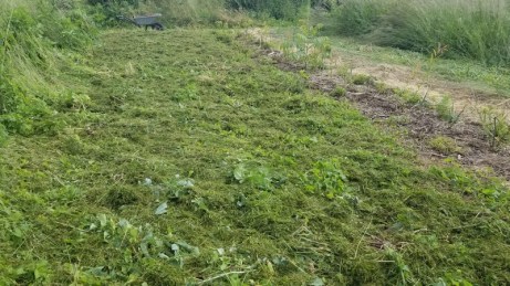 De l’autre côté, deux premières planches pour les poireaux sont recouvertes d’herbe longue. Cela suffira pour planter directement à travers.