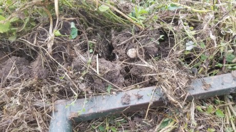 Les brins de liseron ont couvert le terrain où les feuilles d’ail n’étaient plus visibles. Il faut fouiller à la grelinette pour repérer les aulx enfouis.