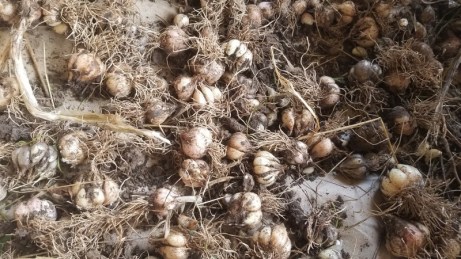 L’an dernier l’ail était une vraie réussite. La récolte au stade où il restait encore quelques feuilles vertes avait rempli des cagettes entières. Ce n’est pas le cas cette année. Même si les têtes restent entières au séchage, on aura envie de les appeler « squelette d’ail » plutôt que tête d’ail. Elle risquent même plutôt de se démantibuler. Il me restera alors à vendre du « confetti d’ail » en servant les bulbes au poids.