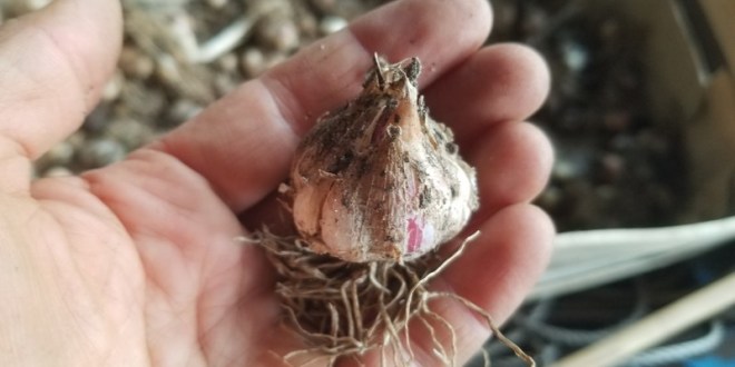 L’an dernier l’ail était une vraie réussite. La récolte au stade où il restait encore quelques feuilles vertes avait rempli des cagettes entières. Ce n’est pas le cas cette année. Même si les têtes restent entières au séchage, on aura envie de les appeler « squelette d’ail » plutôt que tête d’ail. Elle risquent même plutôt de se démantibuler. Il me restera alors à vendre du « confetti d’ail » en servant les bulbes au poids.