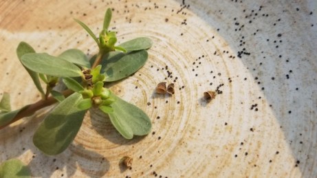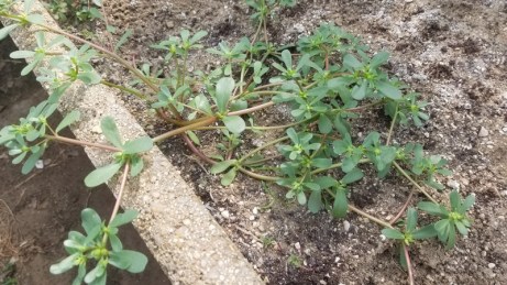 Du pourpier spontané, adventice typique des sols nus soumis à l’érosion. Le sol sableux de la serre lui convient parfaitement.