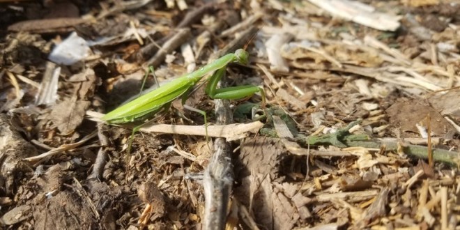 Le semis fait, on arrose. La mante était revenue au milieu de la planche. Elle s’est donc copieusement fait arroser. Et ceci n’a pas semblé lui plaire.